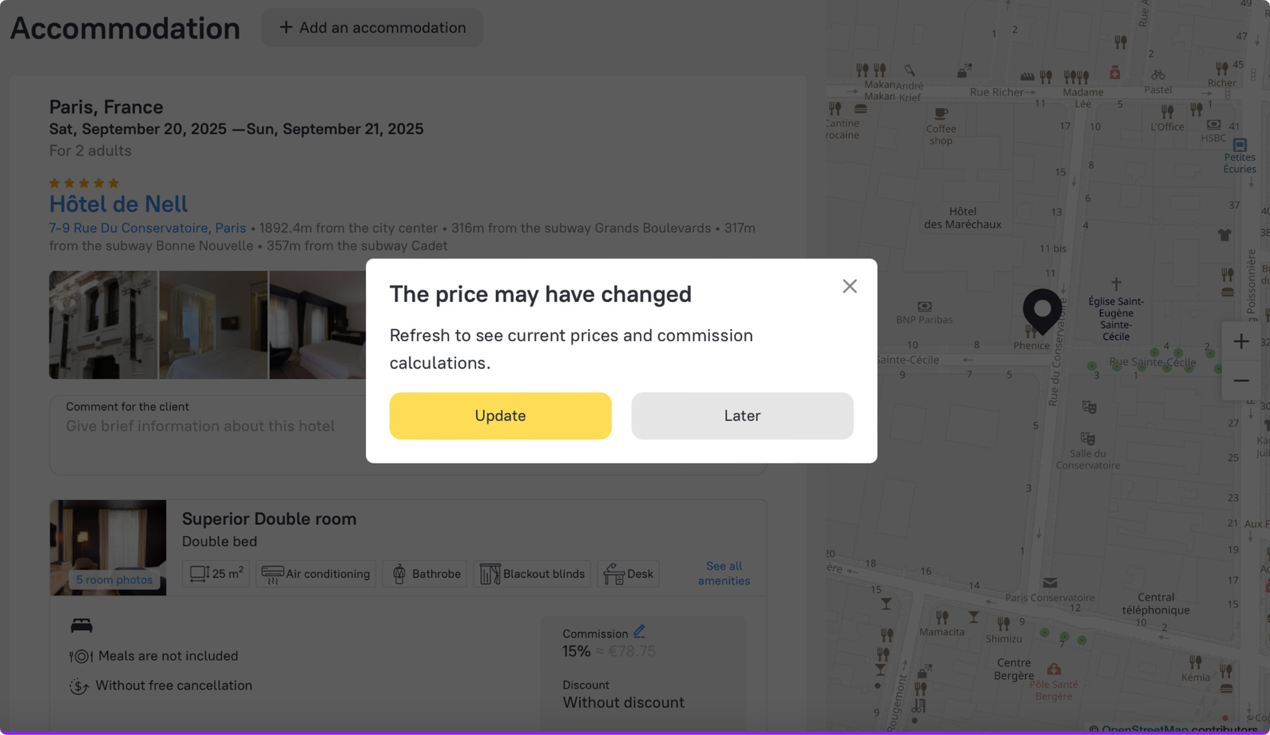 Add the rates by clicking on the “+” sign and selecting the offers you want to include. You can add accommodation options from both Paris and Nice, as well as multiple rates for the same hotel.