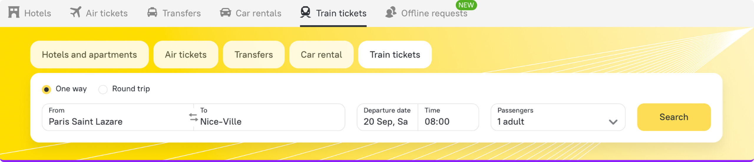 Imagine your client is planning a multi-city trip across Europe. They want to start in Paris, continue on to Nice by train, and finally return home to Munich by flight. With RateHawk, you can build and book this entire journey in just a few clicks.
