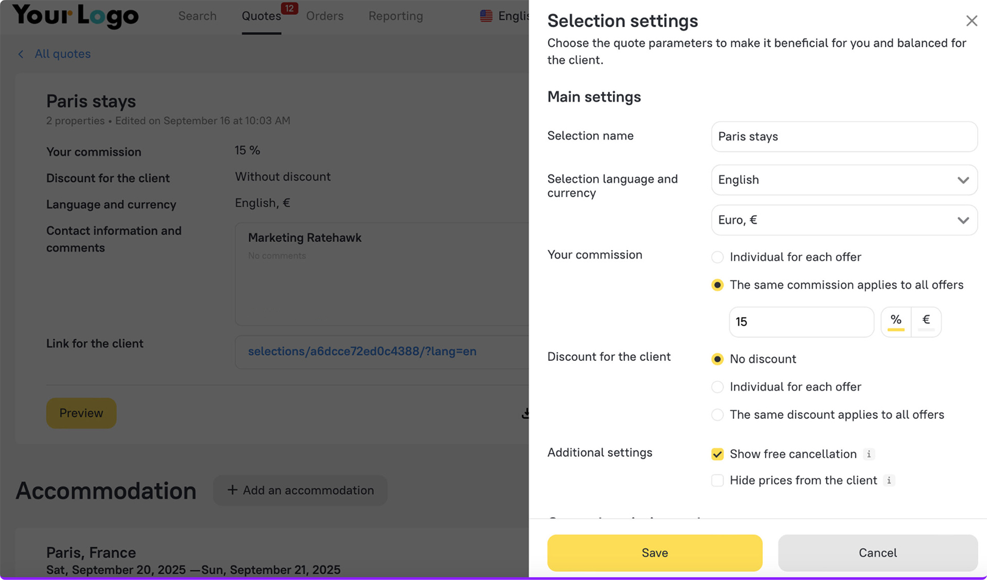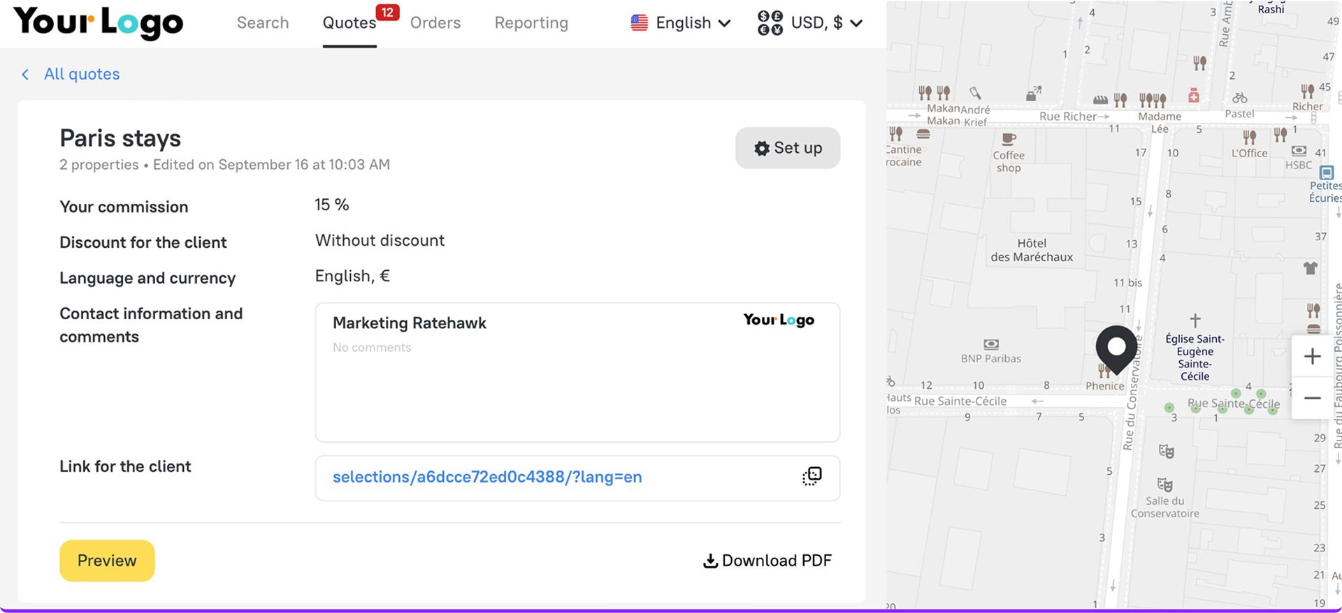 First, build a personalized list of hotel offers that you can share with the client as a link or PDF file. Go to the “Quotes” tab and click “Create a quote”. Start by combining hotels in different cities — here, Paris and Nice — into one polished hotel collection your client can review with ease.