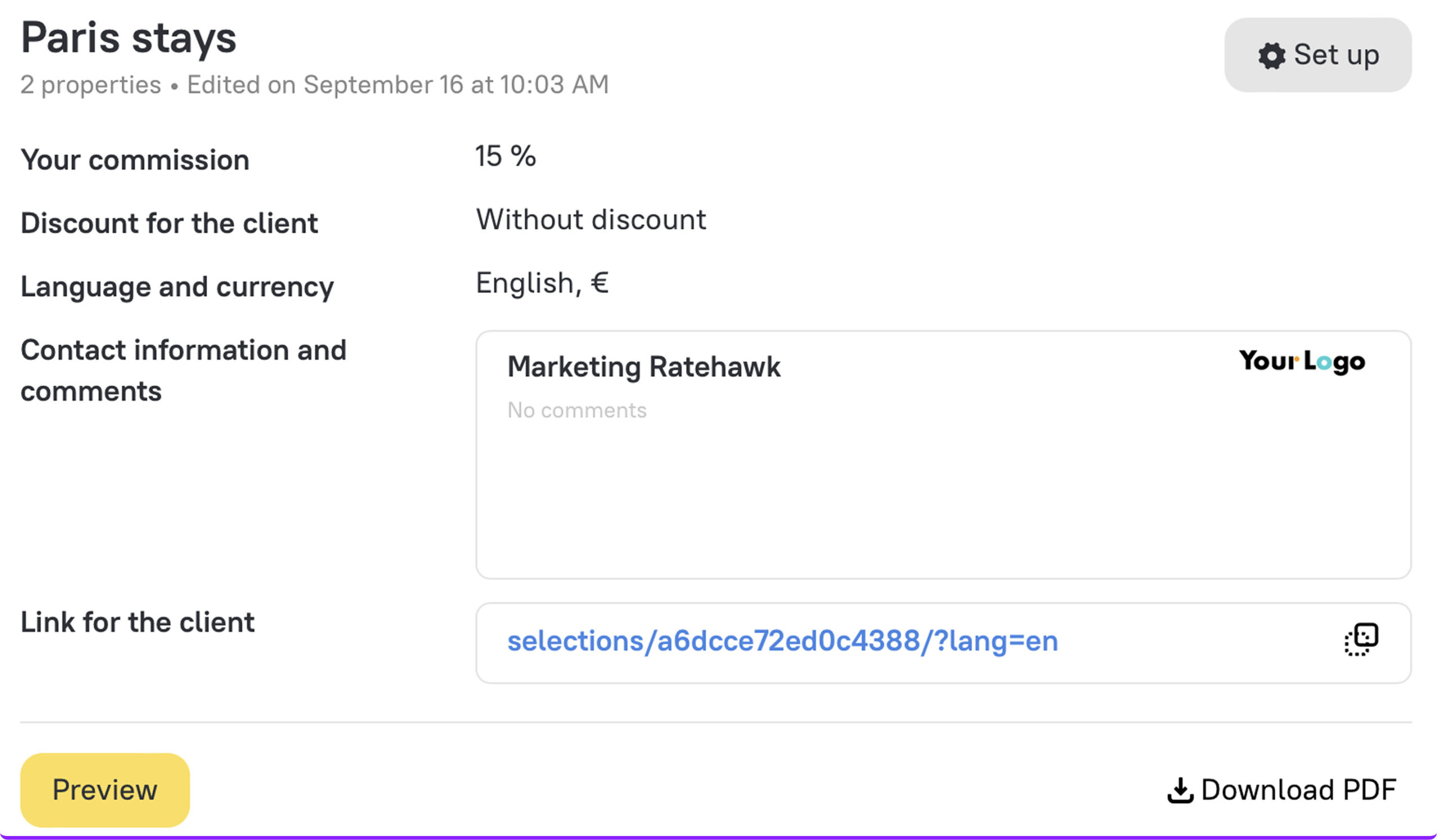 Once you click the “Set up” button, a pop-up window conveniently opens on the right side of your page. Here, you can customize the hotel list faster and easier. In the Settings, you’ll now find a “Hide prices from the client” checkbox — a frequently requested feature that lets you share beautiful collections without displaying rates.