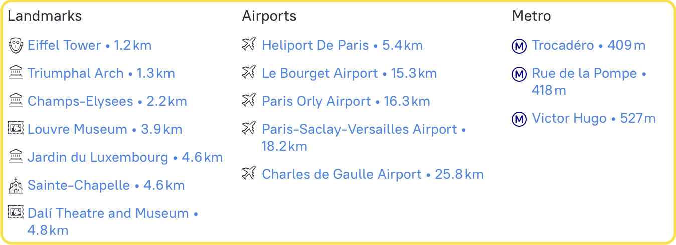 The clients have also requested the hotel be located in a quieter area near the Eiffel Tower and the metro for easy city exploration. We can see that the hotel is only 1.2km away from the Eiffel Tower and also less than 600m away from three metro stations.