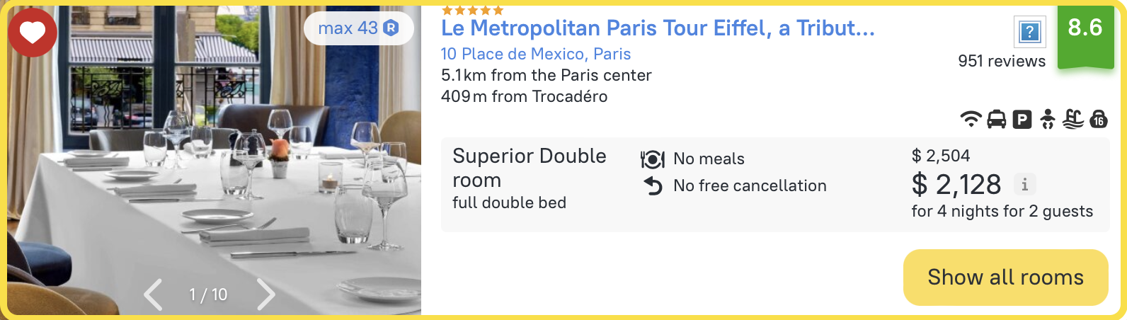 As we know that the Eiffel Tower is a notoriously busy area, we expanded our search to further down the River Seine, closer to the Louvre Museum, to broaden the scope. We’re going to look at “Le Metropolitan Paris Tour Eiffel, a Tribute Portfolio Hotel,” for our travelers.