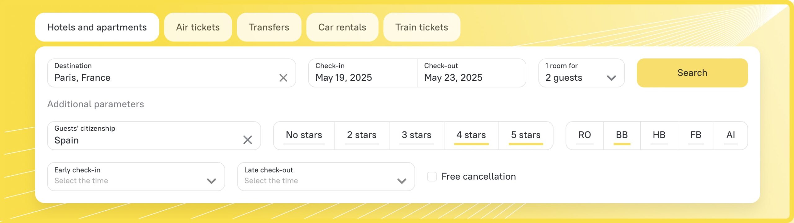 Once you log in to RateHawk, you need to enter the basic details first before refining. Start by entering the details that you know: destination, origin, dates, and the type of passport your clients are holding.