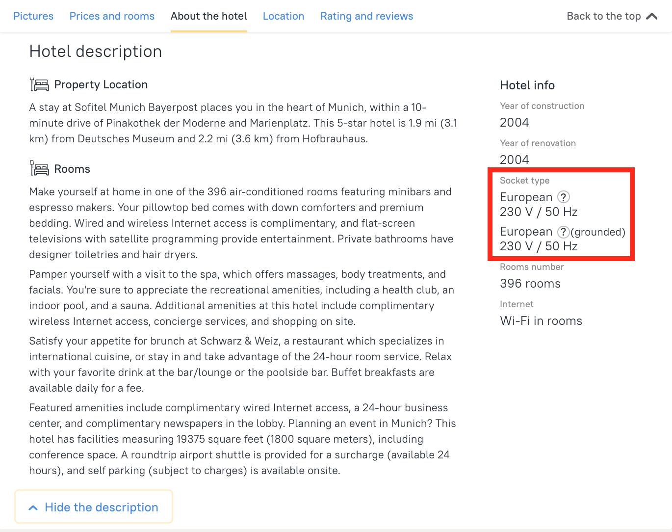 On the RateHawk site, you can check the socket type in the Hotel Description section before you book — look for the information in the Hotel Info block.