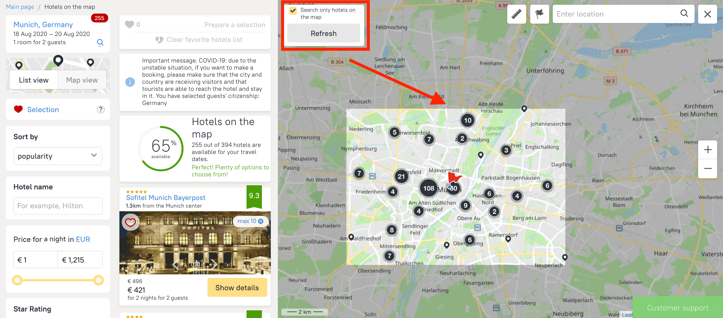 In order to find hotels in a specific district or out of town, select Map instead of the list in the left-hand menu of the search page. On the page that opens tick Find through Scrolling.