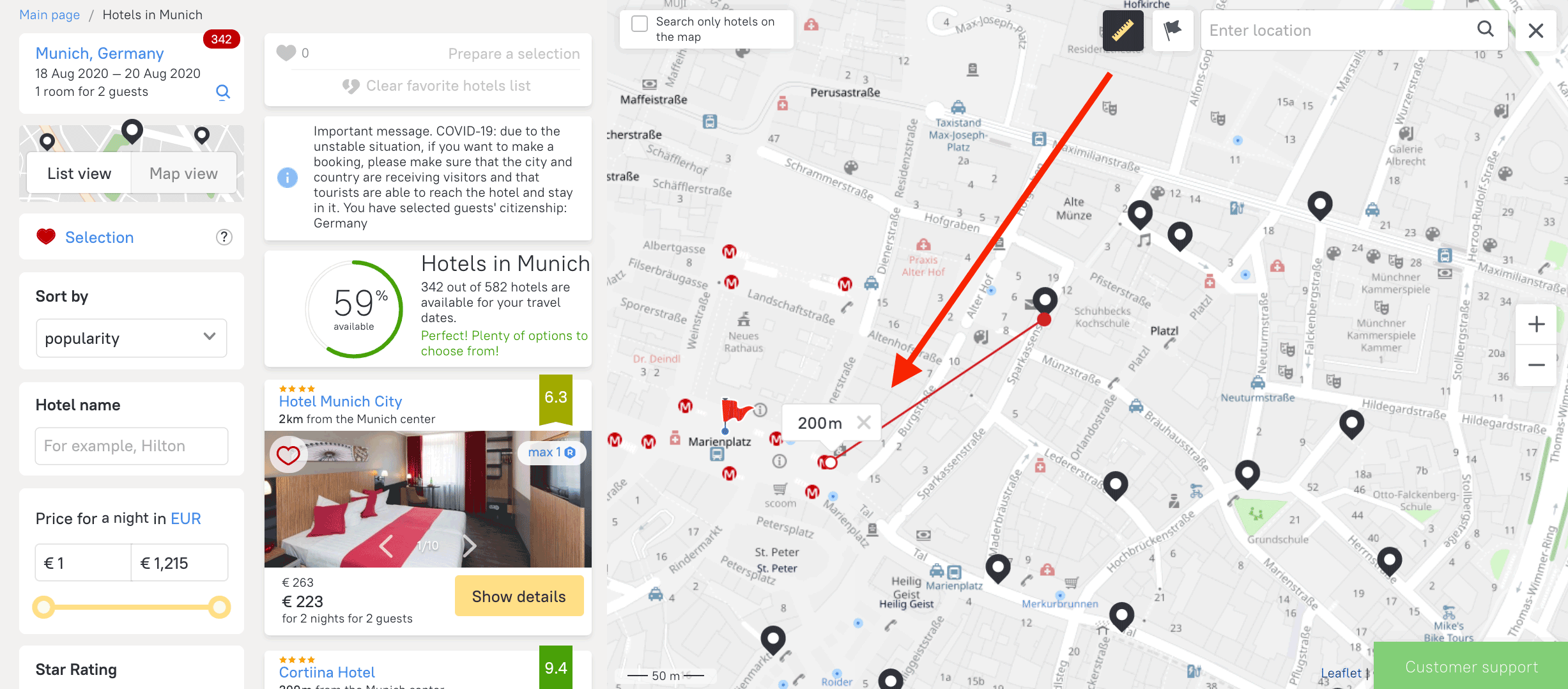 This is our favorite tool! Using the ruler on the map, you can easily calculate the distance in meters from point A to point B. For example, how long the road will take from the hotel to a public transport stop. Thanks to this function, business travelers can estimate more accurately how long it will take them to reach their meeting point, while holidaymakers with children can figure out which tourist attractions/stations/stops are easiest to reach on foot.