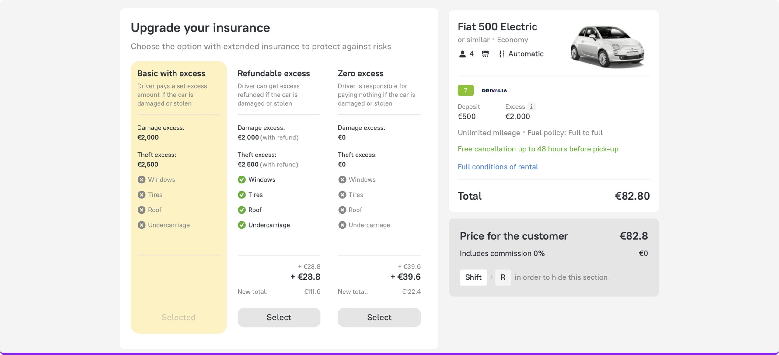Car rental insurance just got more flexible. When you select a basic excess plan, you’ll now see upgrade options right on the booking form — making it easy to compare coverage levels side by side and choose the best fit.