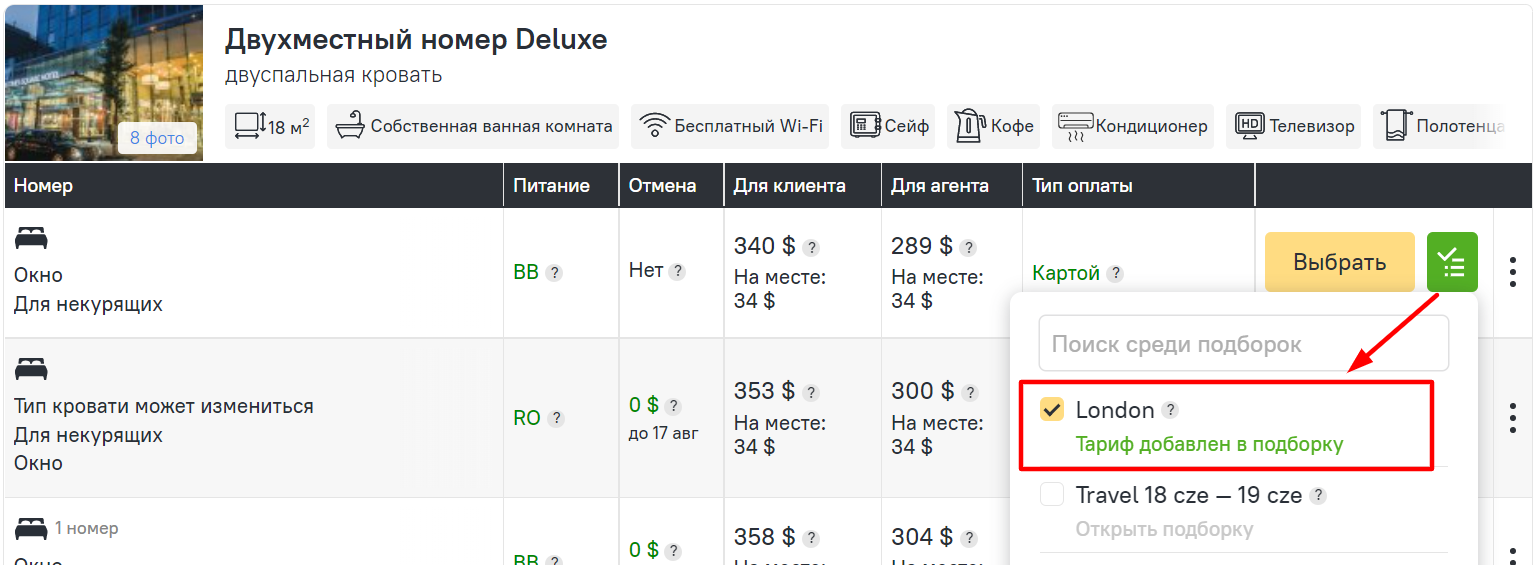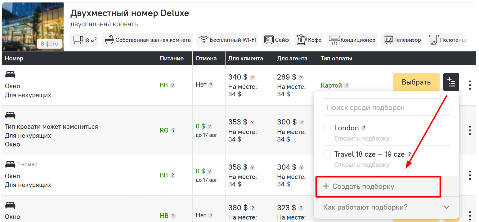 На RateHawk вы можете добавить в подборку конкретный тариф, около каждого есть кнопка «Создать подборку».
