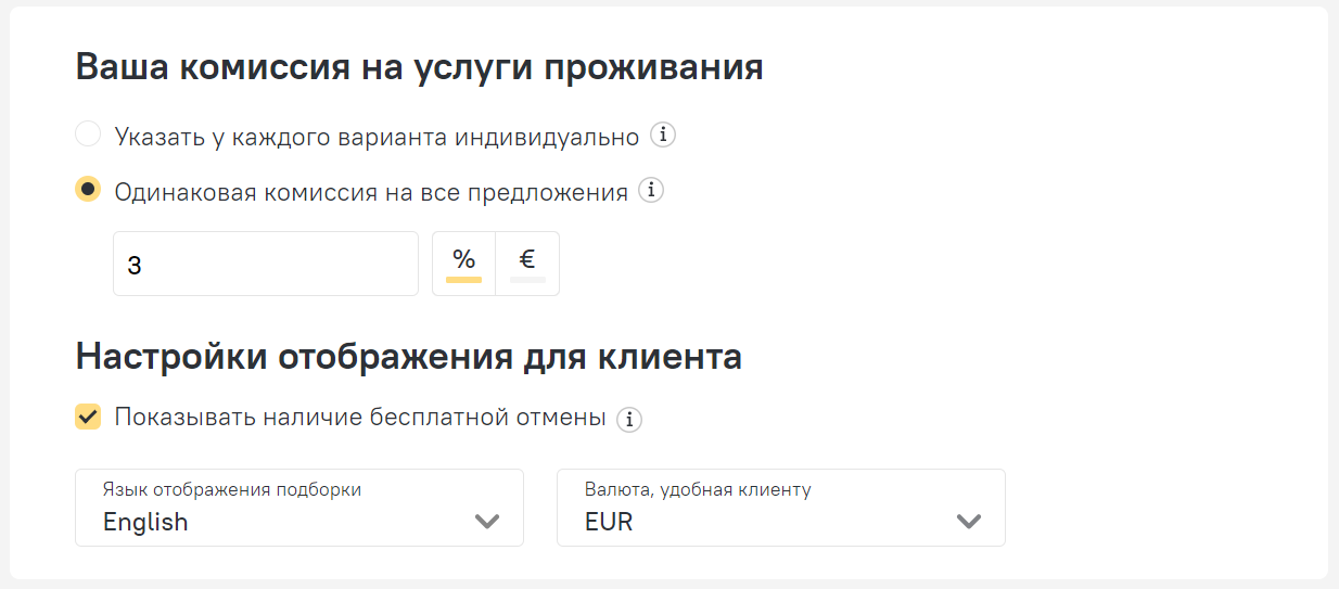Решение: в отельных подборках на RateHawk есть специальная графа «Ваша комиссия на услуги проживания». Независимо от формата (ссылка или pdf-файл) клиент увидит только итоговую стоимость. Ещё одно преимущество: для каждого тарифа можно указать свой размер комиссии!