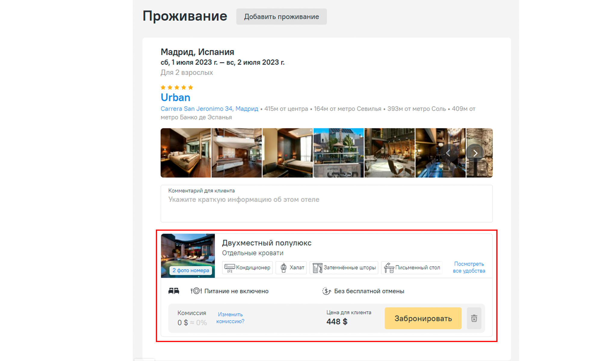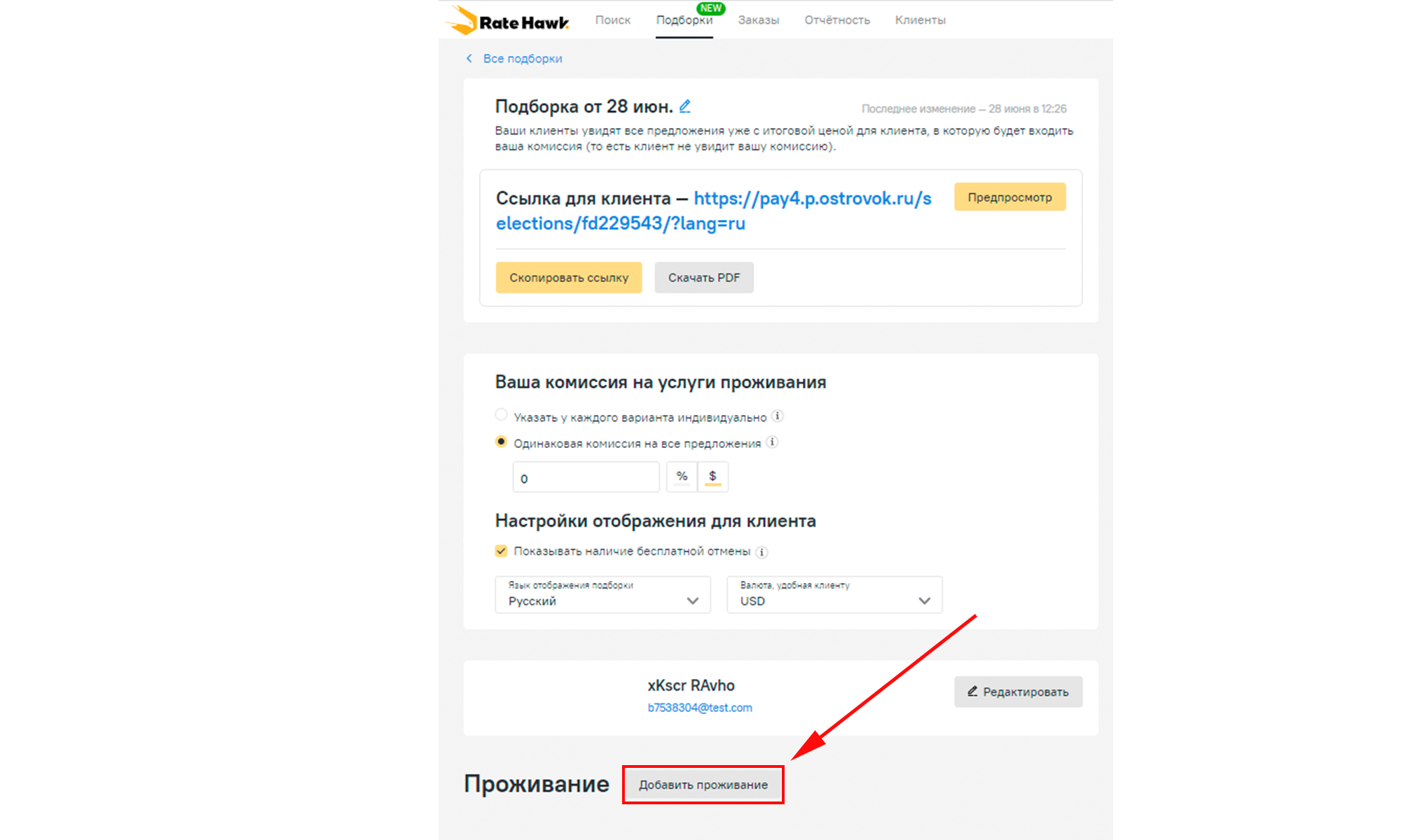 Больше не будет досадных моментов, когда вы забываете изменить комиссию и клиент получает подборку отелей без наценки. Теперь по умолчанию в каждой подборке комиссия из вашего профиля — вы можете её изменить, а можете оставить такой же.