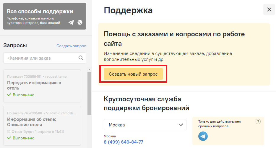 Раньше запросы в «Личном кабинете» были доступны только по бронированиям отелей, теперь же можно обратиться в поддержку и по заказам авиабилетов и трансферов.