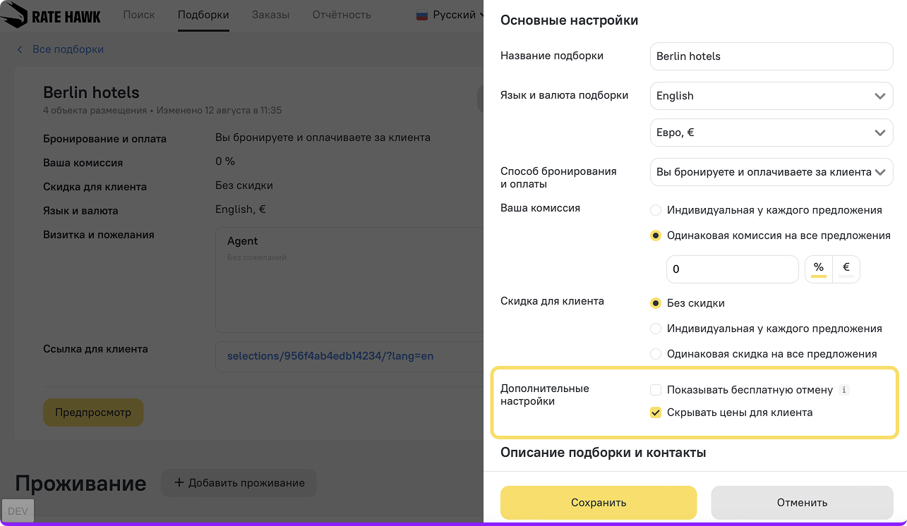 В блоке «Дополнительные настройки» появилась опция «Скрывать цены для клиента» — проставьте галочку в чекбоксе, если хотите отправить подборку без указания стоимости услуг.