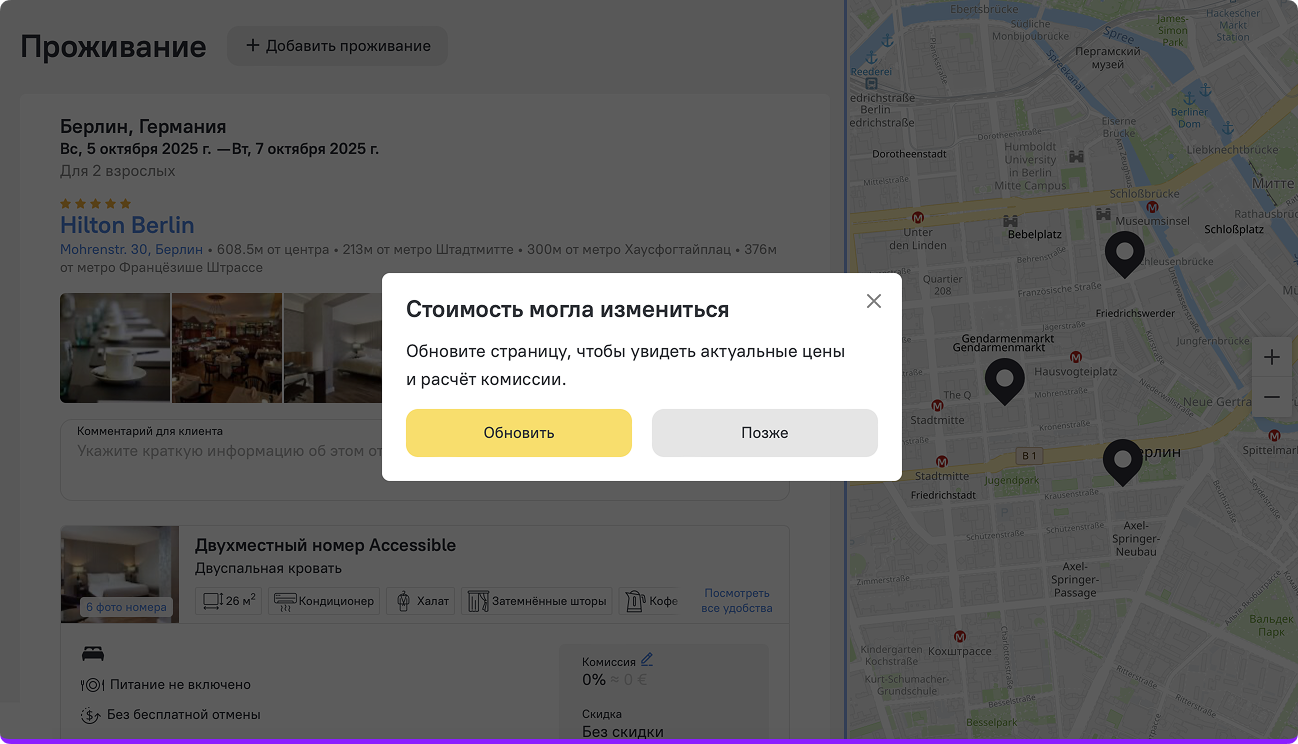 Никаких устаревших цен — тарифы обновляются автоматически при каждом открытии подборки. Кроме того, если вы или ваш клиент открыли подборку более 10 минут назад, появляется всплывающее окно с предложением обновить данные.