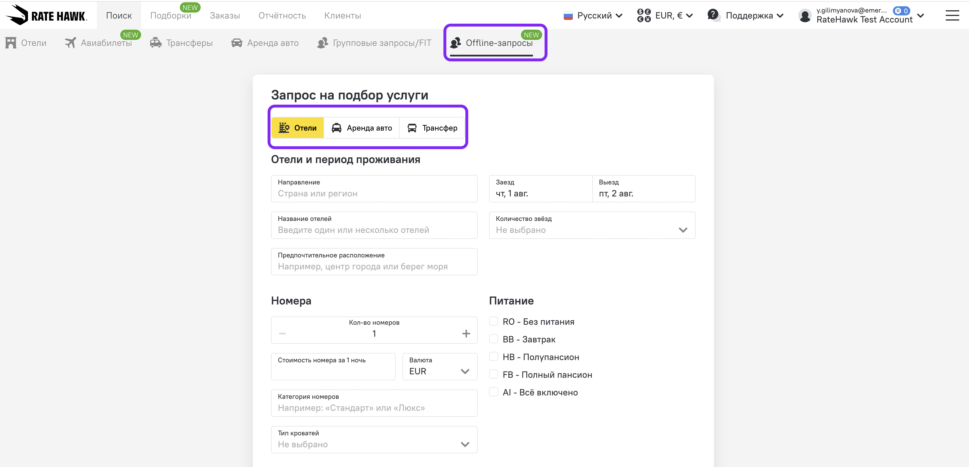 В личном кабинете RateHawk появился новый раздел — «Offline-запросы». Туда переехали формы офлайн-запросов проживания, трансфера и аренды автомобиля.