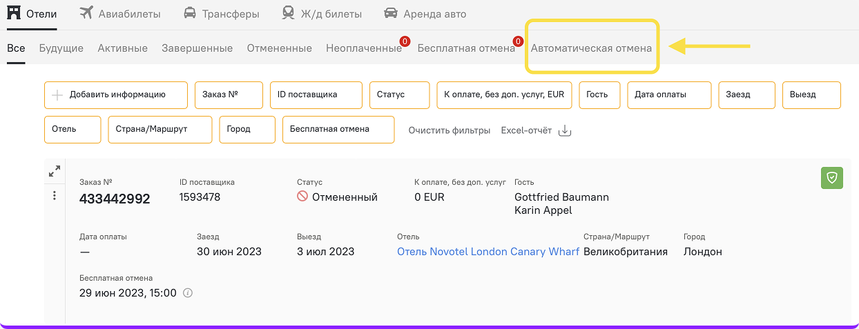 Во вкладке отображаются заказы с возможным аннулированием в ближайшие дни. Например, если вы откроете вкладку «Автоматическая отмена» в четверг, то увидите заказы, которые могут аннулироваться в четверг, пятницу и субботу, а если проверите информацию в пятницу, то увидите бронирования с риском автоотмены в пятницу, субботу, воскресенье и понедельник.