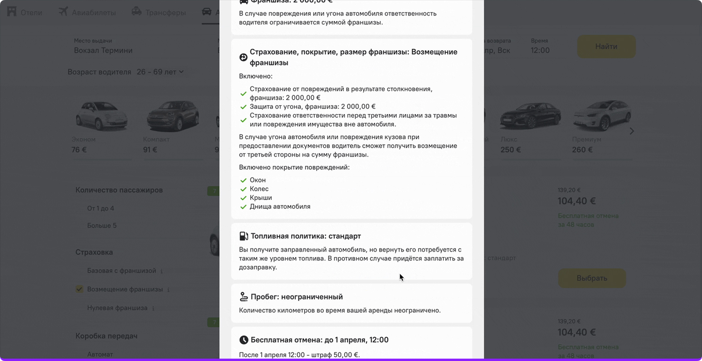 - В ваучер — новый раздел «Страхование, покрытие и размер франшизы». В нём содержится подробная информация о размере франшиз при столкновении и угоне и особенностях страхового покрытия окон, колёс, крыши и днища автомобиля.
