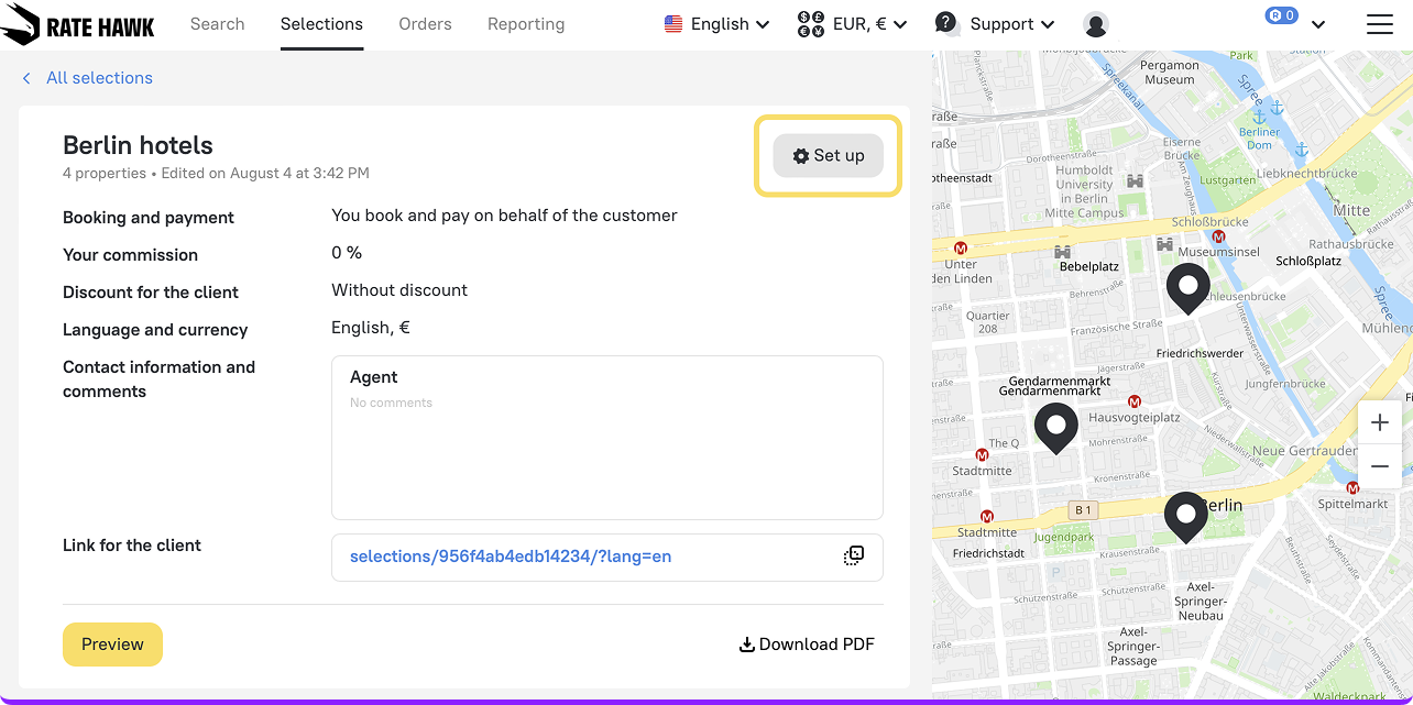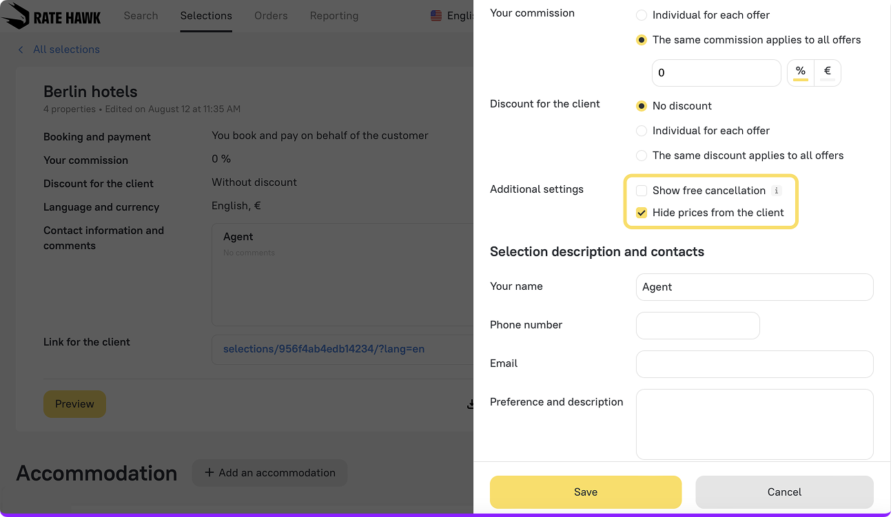 2. Once you click the “Set up” button, a pop-up window conveniently opens on the right side of your page. Here, you can customize selections faster and easier. In the Settings, you’ll now find a “Hide prices from the client” checkbox — a frequently requested feature that lets you share beautiful collections without displaying rates.