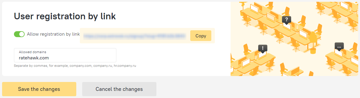 At this stage you may also set restrictions for domain addresses — for example, to allow only users with the domain @yourcompany.ru to be registered. If more than one domain is allowed, please list them using commas as dividers.
