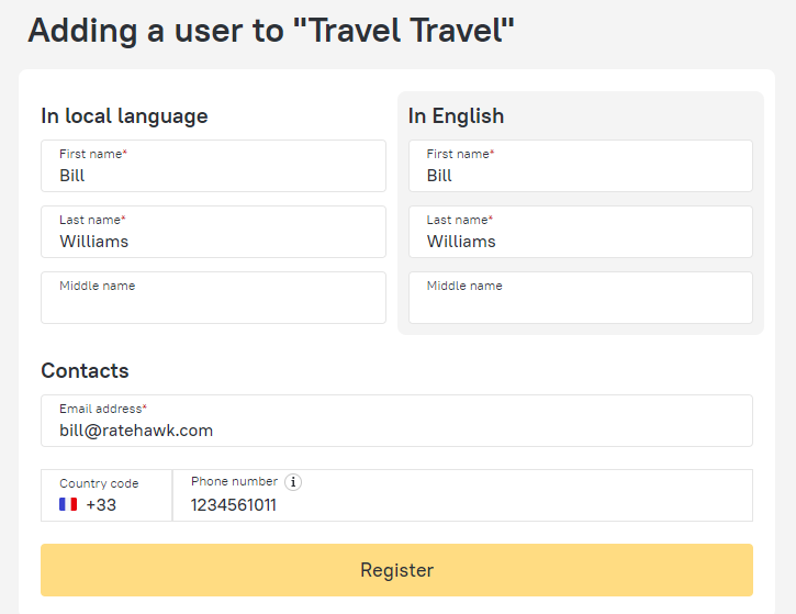 Once your colleague fills in all the mandatory fields and clicks Register they will gain access to corporate rates on RateHawk.