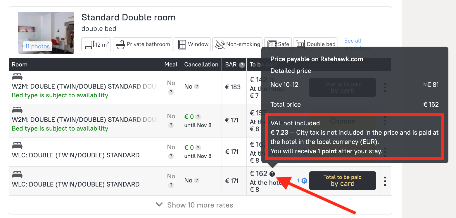You can see detailed information on which taxes are and are not included in the cost on the hotel page when you move the cursor over the question-mark.