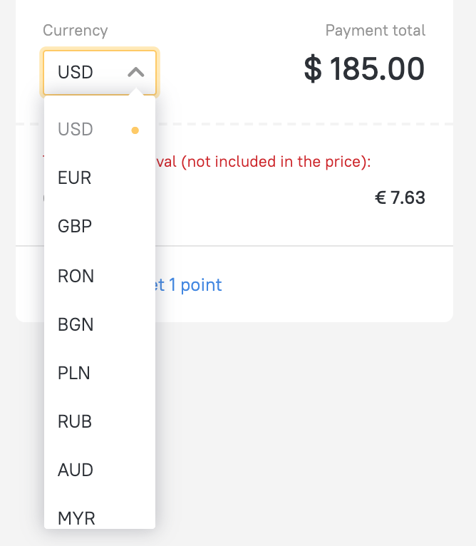 If the currency of your card is not included in the list, it means that its currency is not supported by our processing. In that case, the exchange rate will be recalculated by the bank which issued your card. Please contact the bank which issued your card to check the exchange rate and any possible commission.