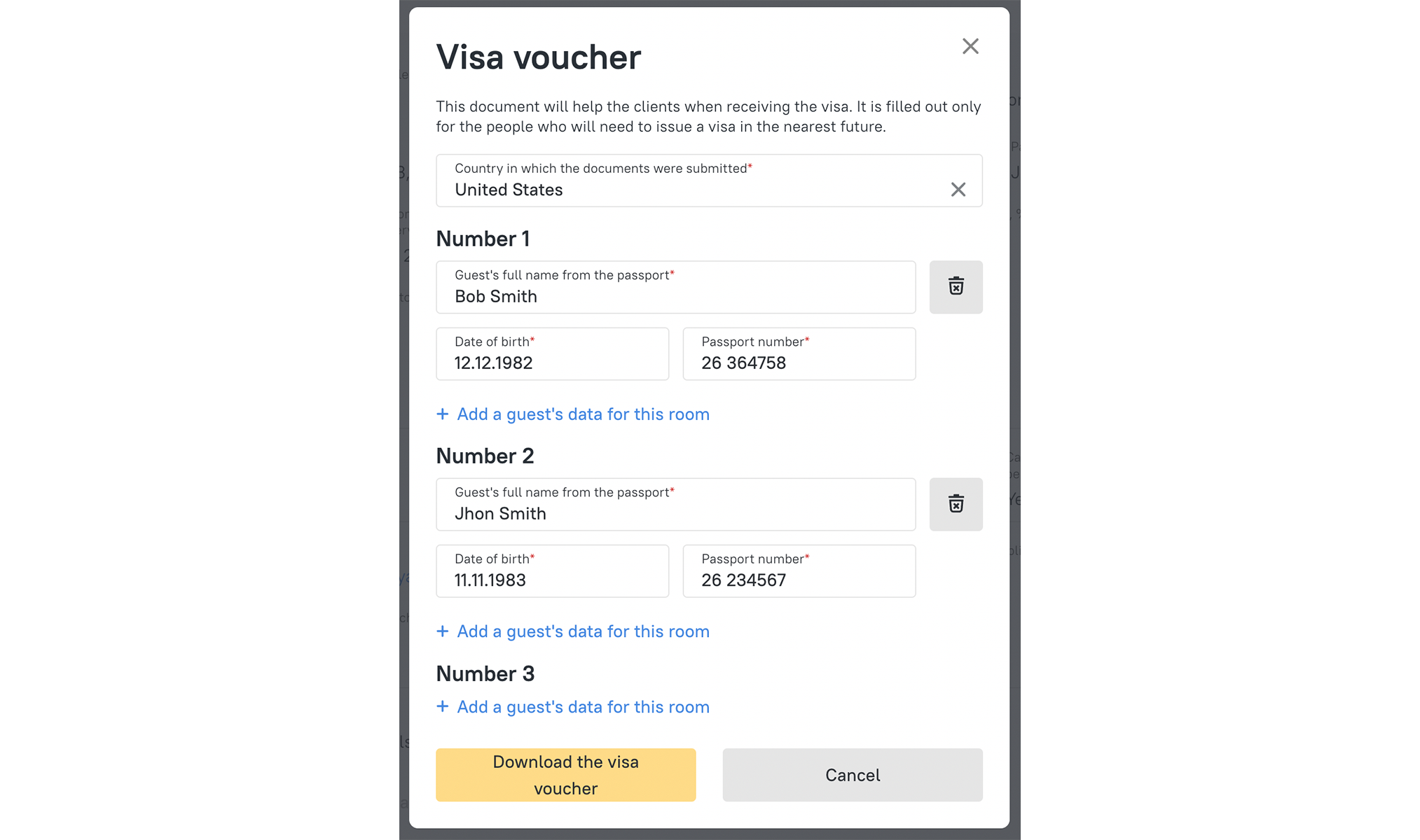 - Fill in the guest’s passport details and click on Download the voucher for the visa. If the booking is for two or more people, click on Add guest’s details for this room. If the booking is for more than one room you may fill in the details of all guests in the same window.