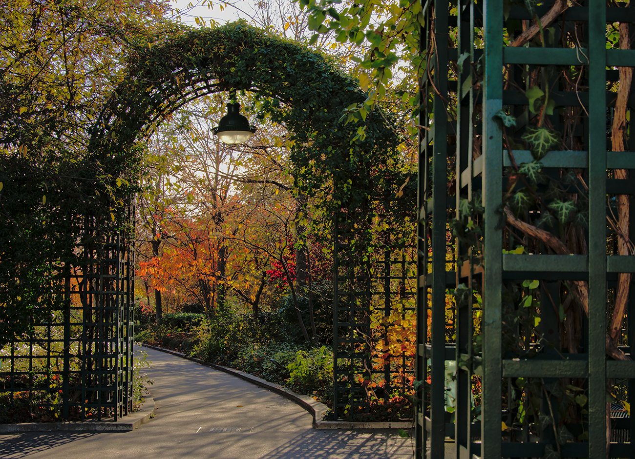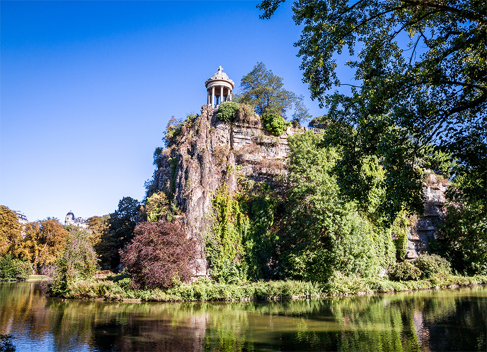 At Parc des Buttes-Chaumont, travelers can wander and explore winding paths that lead to steep hills, panoramic views over Montmartre and the Sacré-Cœur and cross over the iron suspension bridge. They can also cross to the beautiful Temple de la Sibylle circular gazebo sitting on a rocky island.