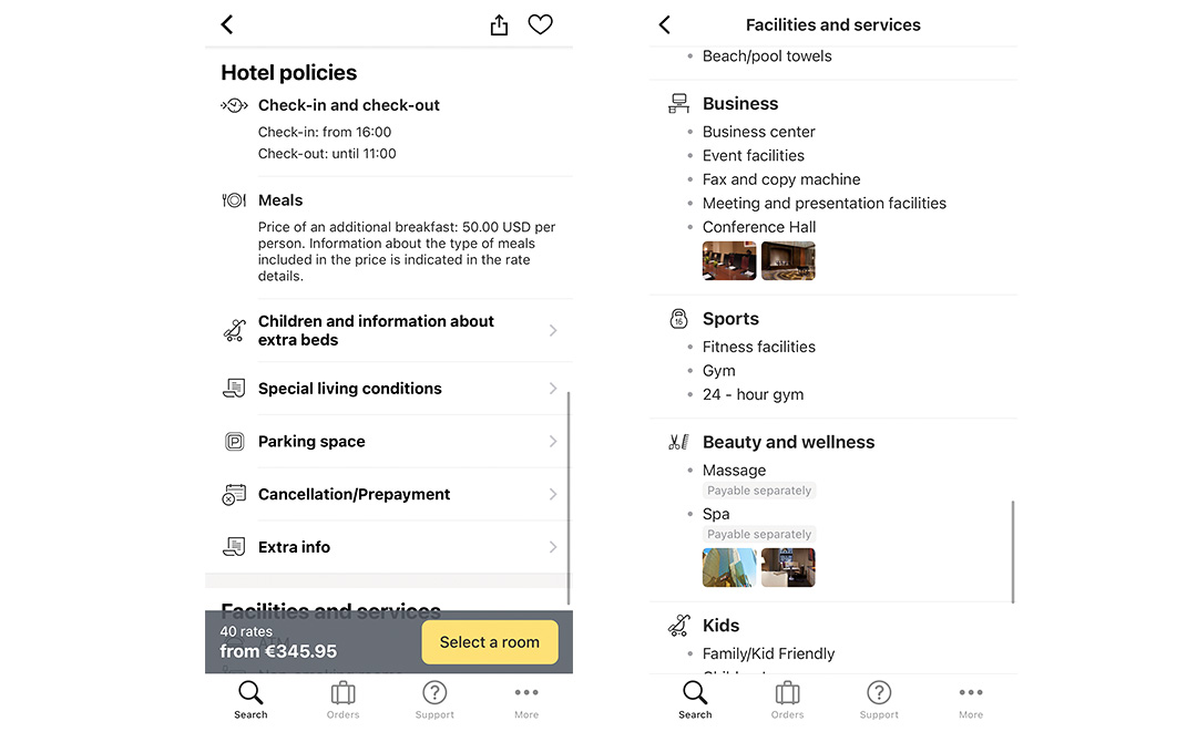 - Facts about the hotel — for example, the year in which it was built or renovated, type of sockets and Wi-Fi terms and conditions.